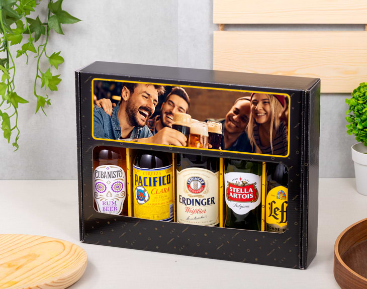 ¿Por qué elegir una sola cerveza cuando puedes tenerlas todas, o la misma pero varias veces? No se trata solo del sabor, sino de la presentación y la decoración. Disfruta de lo mejor en ambos sentidos con este pack premium de las mejores cervezas del mundo. Desde la belga Leffe Blonde hasta la mexicana Pacífico, o la latina Cubanisto. ¡Siente el sabor de los mejores países! Lo mejor de este regalo original para los más cerveceros es que no solo disfrutarán del sabor. Los cinco botellines que escojas vendrán bien sujetos en esta chulísima caja de cartón personalizada. ¡Convierte a tus amigos compañeros de cañas en tu familia Tinok! Escoge entre los cientos de personajes los que más se os parezcan y nosotros os colocaremos pegados sobre la tapa. Porque lo mejor de la cerveza es poder compartirla con tu gente. Y si vivís lejos, dinos la dirección de esa persona especial y nosotros le mandamos esta caja de cartón para cervezas personalizada directamente a su casa, ya sea que viva en España, en Alemania o en Italia. Importante: La disposición de los personajes será realizada por nuestros diseñadores gráficos, adaptando el número de personajes lo mejor posible para conseguir un resultado óptimo. El kit incluye cinco cervezas diferentes: - Pacífico: cerveza mexicana de agua, malta de cebada, arroz y lúpulo. 33cl. *Si Pacífico presenta problemas de suministro, este modelo de cerveza se sustituirá por otro similar e igual de delicioso. - Leffe Blonde: cerveza belga legendaria con una historia que se remonta al año 1240 en la ciudad de Dinant. 33cl. - Stella Artois: cerveza lager belga suave y con un frescor muy característico. 33cl. - Erdinger: cerveza de trigo de tradición bávara considerada la cervecería más grande del mundo. 50cl. - Cubanisto: cerveza de aroma cubano aromatizada con Ron y especias con sabor afrutado de naranja, limón y lima. 33 cl. Importante: Las cervezas que contiene el pack pueden variar según stock. El resto de cervezas disponibles son: - San Miguel 0,0% 25cl. - San Miguel Especial 25cl. - San Miguel sin glúten 33cl. - Cubanisto: cerveza cubana al estilo lager brillante con un toque de ron cubano y especias. 22cl. - Mica: cerveza artesana española elaborada en la Sierra de Fuentenebro al amparo de este mineral con una cebada excelente. 33cl.