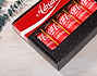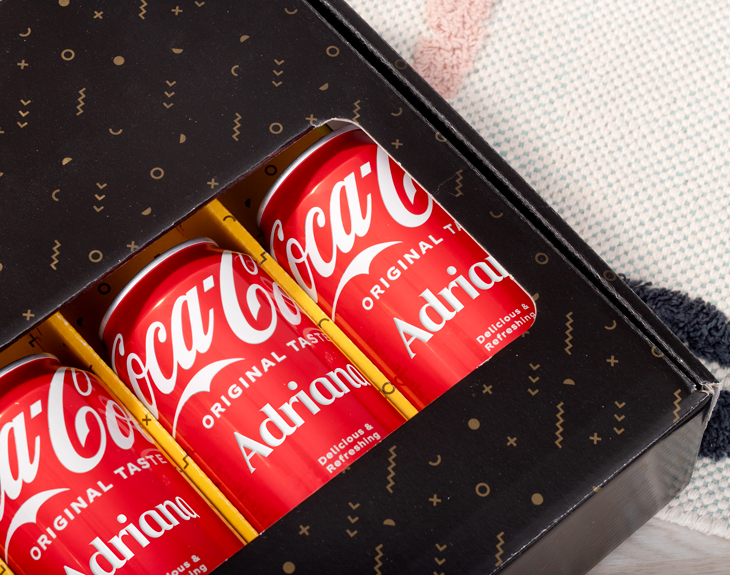 • Caja de cartón personalizada. • Cinco latas de Coca-Colas personalizadas. • Tarjeta Recordatoria.