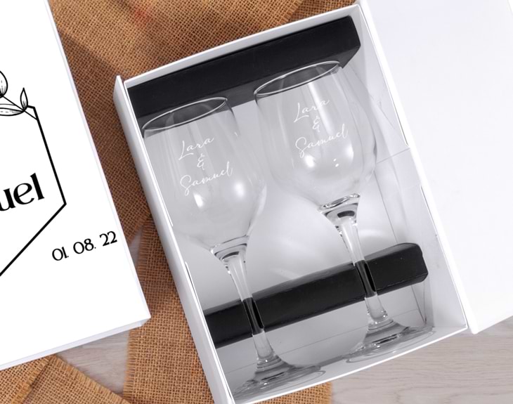 • Caja de cartón blanca (25x18x11cm). • Copa de cristal de vino grabada. • Tarjeta Recordatoria.