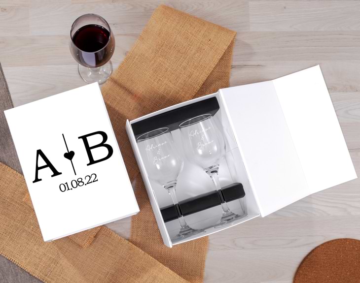 Si hay algo que nunca puede faltar en un boda son las copas para brindar por el amor. Por eso, si dentro de poco te han invitado a una boda súper especial y quieres hacer el regalo más original de todos, nosotros tenemos la mejor opción. Se trata de nuestra caja premium con copas de vino con diseño "Iniciales de amor". Esta caja puede incluir o bien una copa de vino o si lo prefieres puedes escoger la opción que viene con dos copas. ¡Es genial! Además, lo mejor es que esta caja de color negro es personalizable, podrás escribir las iniciales de los novios junto con la fecha del día más bonito de su vida. ¡Les encantará! Personalizar esta caja premium de vino es súper sencillo. El primer paso a seguir consiste en añadir el producto al carrito y entrar al área de personalización. Una vez ahí, ya puedes escribir los nombres de los novios y nosotros nos encargamos de todo lo demás. Pronto estará perfecta y lista para regalar. ¡Será un original regalo para bodas! Medidas de la caja: 25 x 18 x 11 cm.