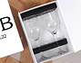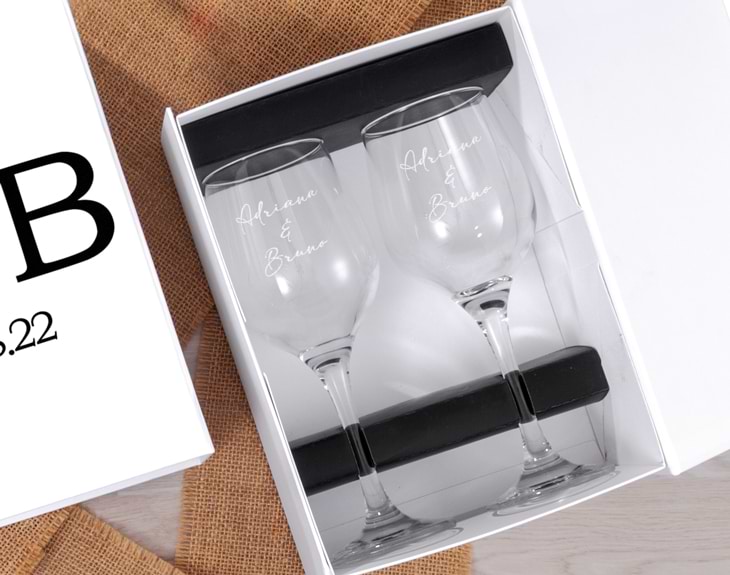• Caja de cartón blanca (25x18x11cm). • Copa de cristal de vino grabada. • Tarjeta Recordatoria.