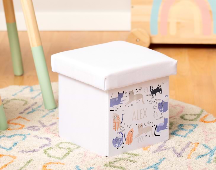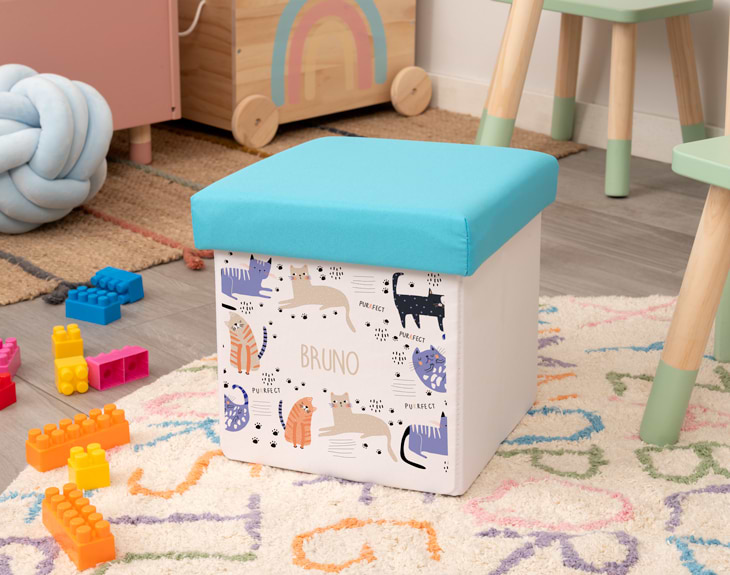 ¿El animal favorito de tu hijo/a es el gato? Si siempre que ve alguno por la calle, se lo quiere llevar a casa, esta caja taburete decorada con “Gatetes monetes” es algo que no puede faltar en su habitación. Así podrá tener a estos gatos tan monos en su cuarto, imagina la carita de felicidad pondrá al recibir esta encantador puf, sin duda, le encantará. ¡Es el regalo perfecto! Esta caja taburete es ideal para enseñarle al más peque de la casa la importancia de recoger y mantener el orden de la habitación. A partir de ahora recoger se convertirá en algo súper divertido. Con sus dimensiones de 23 centímetros cuadrados, habrá espacio de sobra para recoger todo lo que se ponga de por medio. Además, cuando termine de ordenar la habitación, se podrá sentar en esta caja, a descansar, comer o jugar a la consola porque… ¡También es taburete! Pero lo más especial de todo, es que este producto es personalizable. Podrás escribir el nombre del peque de la casa, así todos sabrán de quien es esta caja tan chula. Si quieres descubrir cómo personalizar esta caja taburete continúa leyendo. Es muy sencillo. Primero, añades al carrito este producto y entras al área de personalización. Una vez ahí, escribes el nombre que tú quieras y nosotros nos encargamos de que quede perfecto para regalar.
