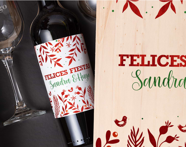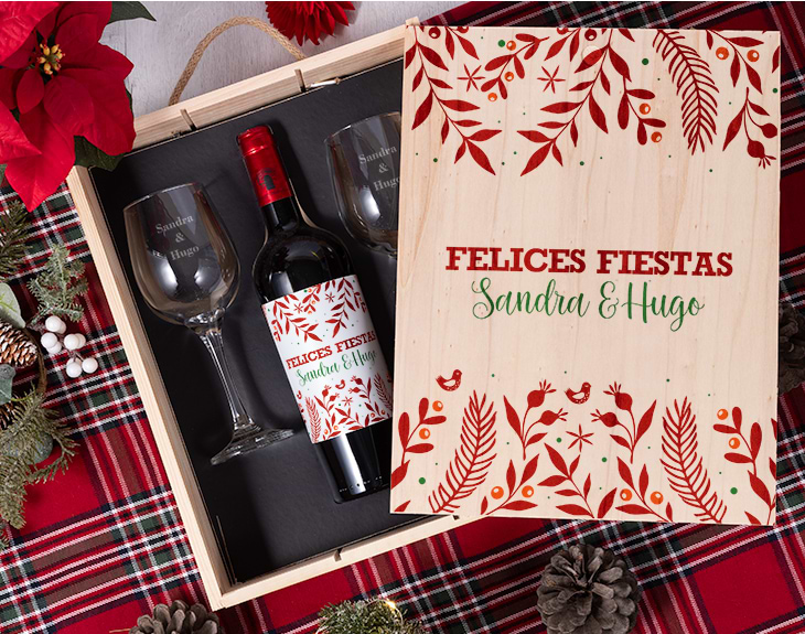 Las navidades son la época perfecta para reencontrarse con viejos amigos y familiares, ya sea alrededor de una cena de Nochebuena o Nochevieja o gracias a alguna fiesta con tu grupo más cercano. ¡Los momentos con tu pareja también son únicos durante la Navidad! Si quieres tener un detalle con esa persona especial o con ese viejo amigo que hace mucho tiempo que no ves, esta caja con vino y copas personalizada está pensada para ti. Y es que esta caja con botella y dos copas con tapa con foto cuenta con un diseño hecho especialmente para las fiestas. ¡Las ramitas de muérdago es algo que no puede faltar en cualquier casa! Este producto es un pack que contiene todo lo necesario para brindar por el nuevo año. Dentro de la caja (hecha de madera y de 37,5 centímetros de alto por 10,5 de profundidad) encontrarás dos copas de 21 centímetros y una botella de vino tinto de 750 mililitros. ¡Un regalazo para estos días tan festivos! ¿Cómo podrás personalizar este regalo original de la forma más única posible? Podrás personalizar todos los productos que encuentras en este pack. Por un lado, podrás incluir vuestros nombres en el diseño de la tapa de la caja, que lo encontrarás en el diseñador una vez añadas el producto al carrito. Además, podremos grabar el texto que quieras en cada copa. ¡Solo tendrás que escribir el texto que quieras en el cuadro de texto! Finalmente, se puede personalizar también la botella de vino con el mismo diseño de la tapa... ¡O con los nombres que quieras! Importante: la caja de madera trae de serie un pequeño círculo superior centrado para abrir cómodamente la caja donde recomendamos no diseñar cosas importantes de la personalización. Altura de las copas: 21 cm. Medidas de la caja: 37,5 cm x 29,5 cm x 10,5 cm. Material: madera. Capacidad de la botella: 750 ml.