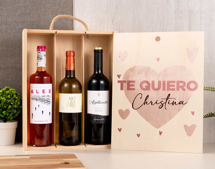 Los mejores momentos con las personas que más quieres siempre ocurren entre copas. ¿Cuántas risas os habéis echado con el vino de una boda? ¿Y esas botellas de tinto compartidas en casa o en cualquier bar? Si quieres crear esos momentos tan especiales allá donde vayas, no te puede faltar en cualquier quedada o casa rural esta caja para vinos personalizada. Solamente ella ya es una manera original de decirle a una persona cuánto la quieres con este diseño. Pero si encima le añades las botellas, ¡se lo demuestras! Puedes elegir si quieres recibir la caja de madera personalizada con surtido de tres vinos. Para que haya de todos los gustos, hemos seleccionado en este pack una variedad ideal: un vino blanco para los más dulces, un rosado para los más especialitos y un tinto para los más clásicos. Podrás llevar cómodamente las 3 botellas de excursión o de cena familiar sobre la caja con asa de cuerda incluida. A la hora de abrirlo, tan solo basta con deslizar la tapa sobre el círculo indicado, ¡y a descorchar y reír! Para darle tu toque personal a este regalo romántico original, hemos incluido un precioso diseño de corazones con la frase "te quiero". Esa persona sabrá que es para ella, ya que podrás escribir su nombre y hasta elegir su color favorito para el dibujo. En muy poco tiempo, ¡crearás tu mayor sorpresa de San Valentín o Aniversario! Medidas: 29x37cm. Importante: la caja de madera trae de serie un pequeño círculo superior centrado para abrir cómodamente la caja donde recomendamos no diseñar cosas importantes de la personalización.
