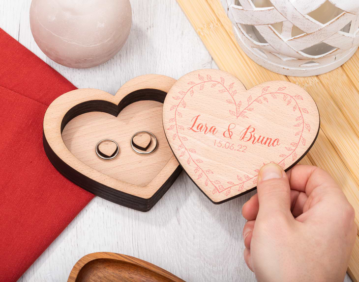 Cuando se acercan fechas especiales para nosotros y nuestra pareja siempre queremos innovar y sorprender con algo que nunca hayan visto antes y les recuerde lo mucho que les queremos y apreciamos que estén en nuestra vida. Una manera de confesar nuestro amor es sin duda la pedida de matrimonio o regalar joyería a juego, por ello nuestro corazón de madera para anillos será ideal para acompañarlos y entregarlos de la manera más bonita. Nuestra caja está hecha de una madera de la mejor calidad, tiene una tapita que se encaja y dentro hay dos pequeños salientes en forma de corazón dónde podrás colocar los anillos: hay muchísimos tipos de anillos para todos los gustos pero con esta cajita ya tendrás la mitad del trabajo hecho y antes de verlos sorprenderás a tu pareja de la manera más romántica. Podrás poner vuestros nombres y la fecha que desees de una manera muy original y estos quedarán rodeados de hojitas en un precioso color rosa pastel. Es un regalo original que al estar hecho en madera os durará toda la vida, ya sea para guardar vuestros anillos cuando no los estéis usando o para usarlo de decoración en vuestra casa. Importante: nuestra cajita no incluye anillos. Tamaño: 12 x 9,5 x 1,6