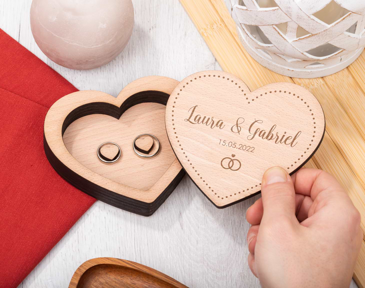 ¿Quieres tener un detalle bonito con tu pareja? ¿Se acerca el día de la boda de tus mejores amigos y no sabes qué regalarles? Nuestro corazón de madera para anillos es un detalle perfecto para todas esas parejas que desean portar sus alianzas de la manera más original. Aunque no hace falta proponerse matrimonio para llevar un par de anillos a juego, es una de las maneras más simbólicas y comunes de decir que ya has encontrado a tu otra mitad y pasarás el resto de la eternidad con ella. Si tu regalo perfecto son unos anillos a juego sin duda esta caja será la manera más chula de presentárselos. No hay nada como compartir una pieza de joyería con tu pareja, es señal de que vuestro vínculo es fuerte y especial. Con esta caja de anillos podrás grabar 2 cosas: vuestros nombres y la fecha que queréis recordar. Puede ser vuestra boda, vuestro aniversario... ¡Eres libre de elegir! Simplemente tendrás que darnos el texto a grabar y nosotros haremos el resto. Importante: nuestra cajita no incluye anillos. Tamaño: 12 x 9,5 x 1,6