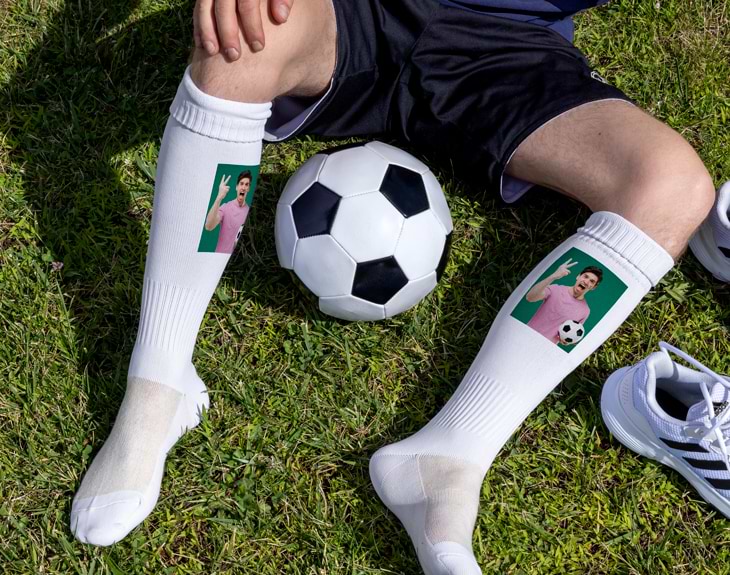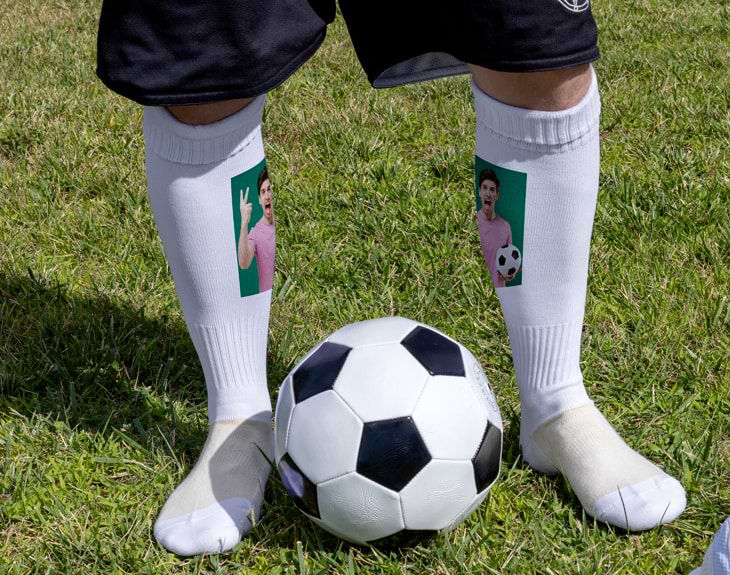 El fútbol es uno de los deportes más jugados de la historia. Tanto niños como adultos lo juegan o lo ven y pasan tardes y tardes compartiendo su ilusión por este deporte, y es que no hay nada mejor que jugar en compañía de amigos y conocidos. Con nuestros calcetines de fútbol personalizados resaltarás como el que más en los partidos del domingo por la tarde. ¡Capta todas las miradas! Nuestros calcetines son un perfecto detalle tanto para regalar como para regalarte a ti mismo: Navidad o cumpleaños, unos buenos calcetines de fútbol siempre vienen bien: si se juega en hierba se manchan constantemente y es bueno tener un recambio, aunque con estos seguro que la persona que los reciba procurará tenerlos siempre listos para llevarlos encima. Conseguirlos es muy sencillo: simplemente tienes que añadirlos al carrito, elegir la talla y subir la foto que desees. También podrás añadirles un nombre para que queden chulísimos y super personales. Este regalo original le encantará a cualquiera que lo reciba y sea un fanático del fútbol. Material: poliéster