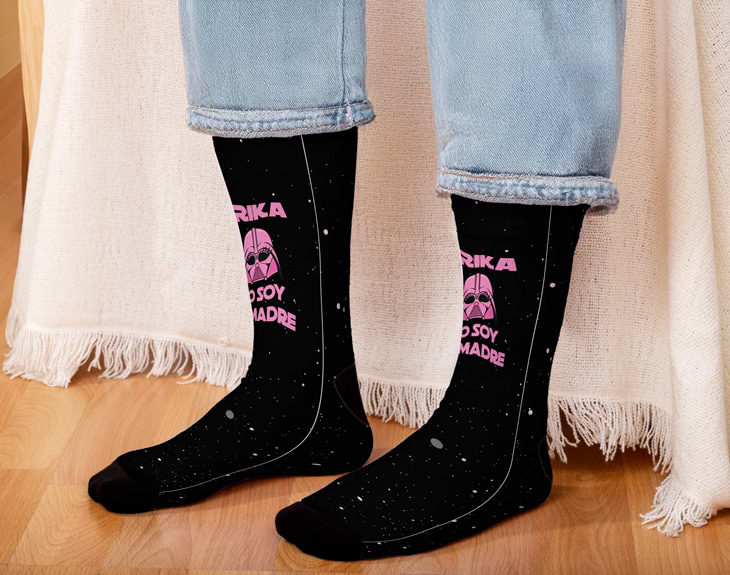 Estos calcetines personalizados con el diseño "Darth Vader Madre" son el detalle perfecto para una mamá fanática de Star Wars. Un regalo original para los amantes de esta icónica saga de películas. Lo que hace únicos a estos calcetines es que son personalizables. Podrás añadir el nombre de tu mamá y completar la frase como si ella fuera el mismísimo Darth Vader. Estos calcetines elásticos son de talla única, por lo que se adaptan perfectamente a cualquier madre. Además, tienes la opción de comprar solo los calcetines o hacer el regalo aún más especial añadiendo una lata personalizada con su nombre, para sorprenderla aún más. Personalizarlos es muy fácil. Solo añade el producto al carrito, entra al área de personalización y añade el nombre de tu mamá. ¡Y listo! Tendrás un original regalo para el Día de la Madre. Un detalle único que hará que tu mamá se sienta muy especial. IMPORTANTE: Talla: única Medidas de cada calcetín: 41x9 cm. Medidas de la caja: 13,5x10,5x4 cm. Medidas de la lata: 11x8,5 cm. Material: poliéster.