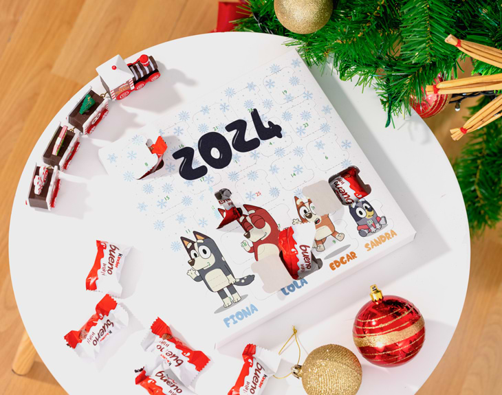 ¿Cual es tu época favorita de año? Si a ti te encanta la Navidad, tenemos algo que te va a venir genial para amenizar la espera. Se trata de nuestro calendario de adviento personalizado con diseño "Familia Bluey", es ideal para que lleves la cuenta atrás de los días que quedan. ¡Tendrás un dulce por cada día! Además, lo mejor es que cuenta con un estampado inspirado en la Familia Bluey, la familia perruna más famosa de todas. ¡Es personalizable! Podrás crear a este avatar Bluey y escribir el nombre que tú quieras. Será un original regalo para Navidad, sorprende al más peque de la casa con este calendario tan guay. ¡Le encantará! Por último, personalizar este calendario de adviento es muy sencillo. El primer paso a seguir consiste en añadir el producto al carrito y entrar al área de personalización. Una vez ahí, ya puedes escoger y crear a estos avatares de Bluey. Pronto estará perfecto y listo para regalar. ¡Será un original regalo para Navidad! Puedes llenar el calendario con las gominolas o chocolates que más os gusten. ¡Tenemos un montón de opciones! Tamaño aproximado: 22,50x22,50 cm