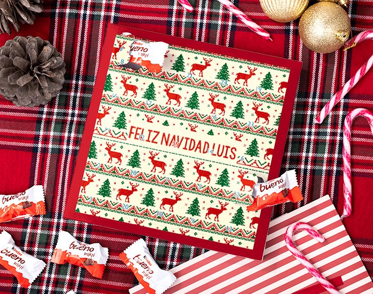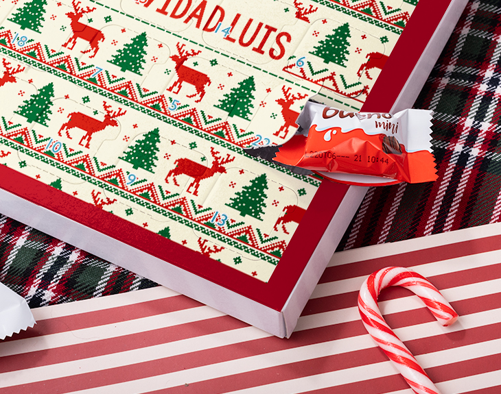 No queda nada para que Papá Noel llegue a llenar de alegría las casas con todos sus regalos. Por eso, este calendario de adviento personalizado es perfecto para contar los días que quedan hasta la noche más mágica del año. Papá Noel y sus renos están ya preparándose para estas fechas, por eso, hemos querido crear este diseño tan divertido. ¡Una manera fantástica de felicitar las fiestas! Solamente necesitamos que nos digas su nombre y las chuches, caramelos o chocolates que quieres para rellenar el calendario. ¿No te parece una idea increíble? Tamaño aproximado: 22,50x22,50 cm Importante: si puedes tener reacción a cualquier tipo de alérgenos, puedes escribirnos para consultar si hay alguna opción alternativa.