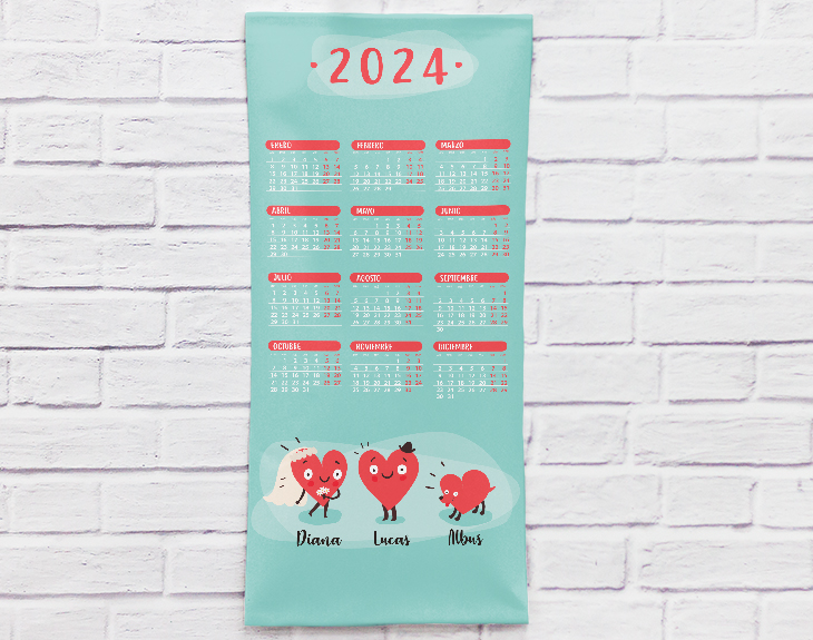 ¿Os encanta tener calendarios en casa? Si sois de esos que apuntáis todas las fechas señaladas en el calendario y sin él no sabéis ni en qué día vivís, este calendario personalizado está hecho para vosotros. Además, no se trata de un calendario cualquiera, puedes personalizarlo con nuestra familia más amorosa de todas... ¡La familia corazón! Está formada por un montón de personajes haciendo diferentes actividades, eso sí, todos ellos adorables. Solo tienes que escoger los muñecos con los que más identificados os sintáis y decirnos los nombres. Así todo el mundo cuando entre a vuestra casa sabrá que allí reina el amor. ¿No os parece una idea genial? Importante: a partir de 6 personajes. se colocarán en dos filas. Es decir: - Familia de 6 personajes: 3 en la fila superior, y 3 en la inferior. - Familia de 7 personajes: 4 en la fila superior, y 3 en la inferior. - Familia de 8 personajes: 4 en la fila superior, y 4 en la inferior. Medida:53x30cm