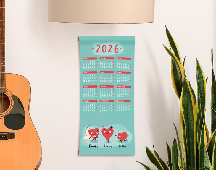 ¿Os encanta tener calendarios en casa? Si sois de esos que apuntáis todas las fechas señaladas en el calendario y sin él no sabéis ni en qué día vivís, este calendario personalizado está hecho para vosotros. Además, no se trata de un calendario cualquiera, puedes personalizarlo con nuestra familia más amorosa de todas... ¡La familia corazón! Está formada por un montón de personajes haciendo diferentes actividades, eso sí, todos ellos adorables. Solo tienes que escoger los muñecos con los que más identificados os sintáis y decirnos los nombres. Así todo el mundo cuando entre a vuestra casa sabrá que allí reina el amor. ¿No os parece una idea genial? Importante: a partir de 6 personajes. se colocarán en dos filas. Es decir: - Familia de 6 personajes: 3 en la fila superior, y 3 en la inferior. - Familia de 7 personajes: 4 en la fila superior, y 3 en la inferior. - Familia de 8 personajes: 4 en la fila superior, y 4 en la inferior. Medida:53x30cm