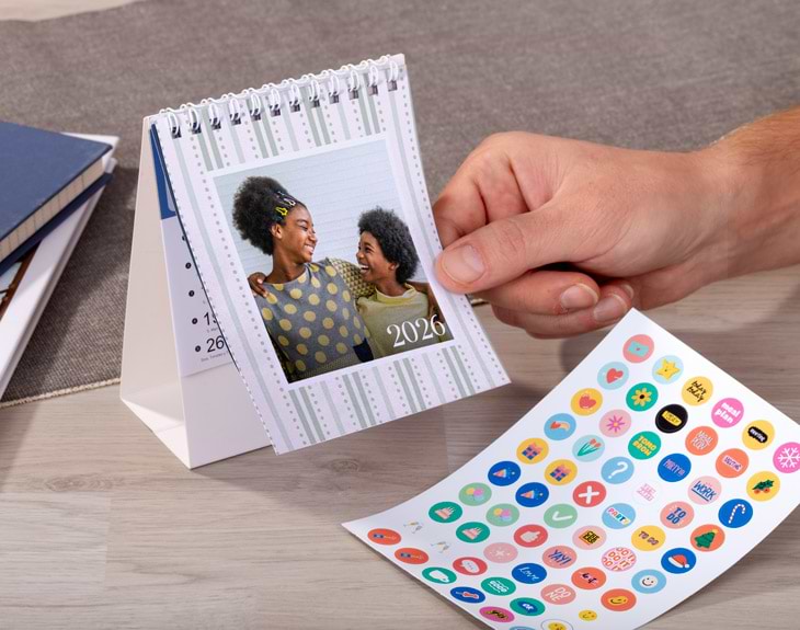 ¡Haz check a todos tus planes y empieza el año organizando tu tiempo con un toque especial! Con este calendario de mesa personalizado, tendrás siempre a mano tus tareas, citas y momentos importantes, para que no se te escape nada. Gracias a su diseño alegre, colorido y lleno de buen rollo, 2026 puede ser el año perfecto para cumplir todos esos sueños que llevas tiempo imaginando. Lo más especial de este calendario es que puedes personalizar la portada con la foto que tú elijas. Además, tienes varios fondos de colores disponibles para que escojas el que más te guste y mejor encaje contigo. Empieza el año con energía, motivación y una gran sonrisa. Y si quieres convertirlo en un detalle aún más especial, añade una plancha de stickers temáticos con los que podrás decorar cada mes como más te guste. Sin duda, es un regalo original y práctico para sorprender esta Navidad o el Día de Reyes. Ideal para regalar a esa persona que adora tenerlo todo bajo control... ¡o que quiere empezar a hacerlo! Personalizar tu calendario es facilísimo: añade el producto al carrito, accede al área de personalización, elige el fondo que más te guste y sube tu foto favorita. En pocos pasos tendrás un detalle especial, listo para regalar (o para ti, que también te lo mereces).