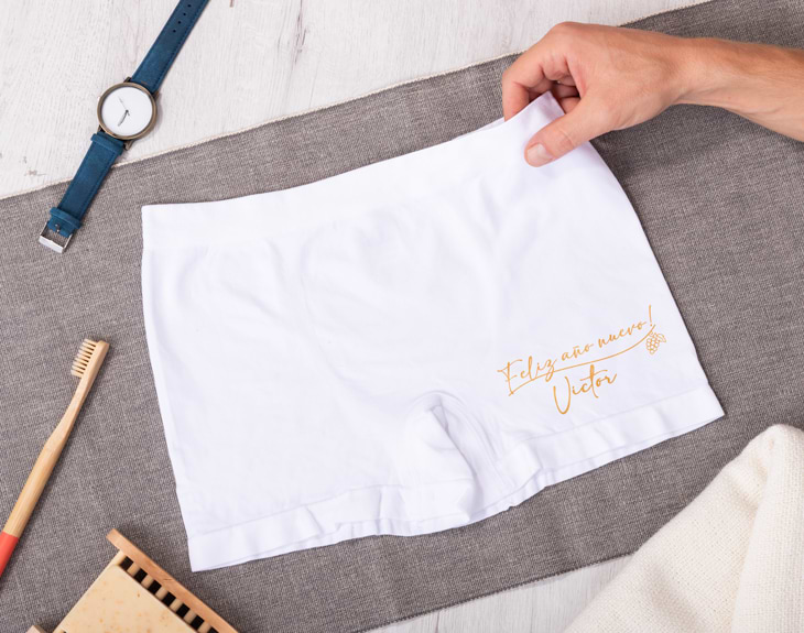 Ahora que el año llega a su fin, se acerca el momento de hacer una lista con los propósitos de Año Nuevo, cierre de ciclos, nuevos proyectos... Sin duda, es una época muy especial cargada de emociones. Uno de los rituales para comenzar bien el año consiste en estrenar ropa interior, por eso, este calzoncillo "Feliz Año Nuevo" es ideal para comenzar el año de la mejor manera posible. También se puede convertir un regalo original para desear a esa persona tan importante que tenga un año lleno de amor, risas y momento especiales. Te asegurarás de que esa persona comience el año con una gran sonrisa. Estos calzoncillos personalizados están fabricados con poliamida, un tejido elástico y transpirable, cuentan con una cinta elástica para que se ajusten perfectamente a la cintura. Además, puedes escoger entre diferentes tallas (M, L y XL), así todo el mundo podrá disfrutar de estos increíbles calzoncillos personalizados. ¡Será un regalo de lo más original! Este original regalo de Nochevieja es muy sencillo de personalizar. El primer paso a seguir consiste en añadir el producto al carrito y entrar al área de personalización. Una vez ahí, ya puedes personalizarlo con el nombre que tú quieras. ¡Serán los mejores calzoncillos para Año Nuevo! Talla: - Talla M: 33,5 x 25 centímetros. - Talla L: 36 x 26 centímetros. - Talla XL: 47 x 31 centímetros. Material: poliamida (90%) y elastano (10%). Color: negro. Importante: se puede lavar a una temperatura máxima de 30 grados. No es recomendado usar lejía ni secarlo en la secadora. No se debe planchar.