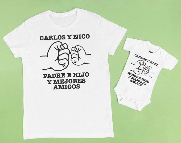 ¿Acaso hay algo más cuqui que compartir vestimenta con tu hijo? Podéis salir a juego y que todo el mundo vea lo unidos que estáis. Y es que puede que esa pequeña criatura que acaba de llegar al mundo todavía no sepa quienes sois, pero estamos seguros que ya es lo más importante para vosotros, casi como si fuera vuestro mejor amigo. Por eso tenemos estos camiseta y body personalizados, un pack tan inseparable como vuestro amor. Y es que estamos seguros de que esa personita se ha convertido en lo más esencial de tu vida, alguien a quien necesitas proteger y cuidar por encima de todas las cosas. Tanto rato juntos os convertiría prácticamente en mejores amigos. Es por eso que este diseño es tan original y divertido. Podrás ponerle el body al bebé, y así todo el mundo sabrá que sois el dúo más guays del barrio. ¿Se os ocurre un regalo más divertido para este Día del padre? A nosotros desde luego que no. Podrás personalizar ambos productos, añadiendo vuestros nombres en cada prenda para que este regalo original sea aún más especial y único. Material: - Algodón: 100% algodón. Importante: Las medidas son aproximadas, pueden variar 5cm por encima o por debajo.