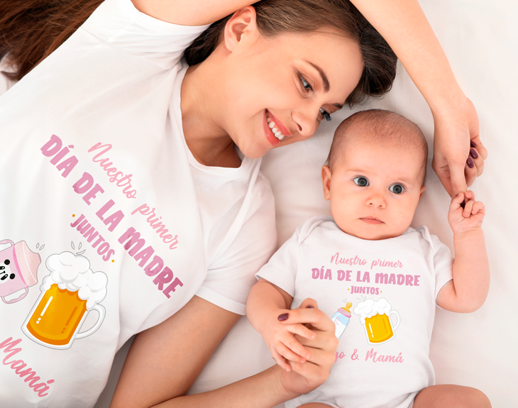 ¡Celebra el primer Día de la Madre con un regalo verdaderamente especial! Con este pack de camiseta y body personalizado emocionarás a toda la familia. Un detalle que dejará sin palabras a la mamá primeriza. No hay nada más tierno que ir a juego y tener un recuerdo de este primer día tan especial. Sin duda, el Día de la Madre es uno de los momentos más importantes para celebrar, y este pack es ideal para una ocasión tan significativa. Lo mejor de todo es que es personalizable. ¡Podrás elegir los nombres y escoger entre varios diseños! ¿Biberón, cerveza, café? ¡Elige el que mejor los represente! Personalizar este pack de camiseta con body es muy sencillo. Solo añade el producto al carrito y entra al área de personalización. Allí podrás escribir los nombres de la mamá y del bebé en este bonito diseño, y luego elegir las tallas y colores tanto de la camiseta como del body. Nosotros nos encargaremos de que quede perfecto y listo para regalar. ¡Será el regalo original para madres primerizas que tanto esperaban! Material: - Algodón: 100% algodón. Importante: Las medidas son aproximadas, pueden variar 5cm por encima o por debajo.