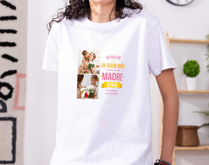 Tu madre es genial porque te tiene a ti, porque tiene la suerte y el privilegio de tener un hijo o hija como tú. Y es que la principal razón por la que una madre es lo que es son sus hijos. Por eso, si queréis tener un detalle único con mamá, sorpréndela con esta camiseta personalizada. es el regalo perfecto para decirle que es la mejor y la madre más genial del mundo. Además, podrás añadir vuestras fotos favoritas, así este regalo terminará de conquistar el corazoncito de tu madre. A veces puede ser complicado regalar a mamá y acertar, pero con esta original camiseta acertarás seguro. Es un regalo único y perfecto para el Día de la Madre o su cumpleaños. Le encantará recibir un regalo tan especial y hecho especialmente para ella. Lo mejor es que podrás elegir el tipo de prenda que quieras: camiseta, sudadera, manga larga, manga corta... ¡Hay para todos los gustos! Personalizar esta camiseta es muy fácil. Lo único que tienes que hacer es elegir la prenda que quieres, añadir el producto al carrito y comenzar a crear tu diseño. En la plantilla que te dejamos añade tus fotos favoritas y escribe una breve dedicatoria en la parte inferior del diseño. Así de fácil es crear tu propia camiseta para mamá. ¡Será el mejor regalo del mundo! Material: - Algodón: 100% algodón. - Tacto algodón: 100% poliéster cotton touch. - Técnicas: 100% poliéster. Importante: Las medidas son aproximadas, pueden variar 5cm por encima o por debajo.