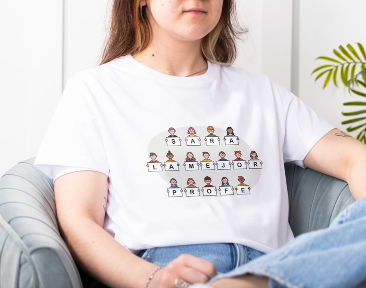 ¿Lleváis tiempo queriendo decirle a vuestra profe lo genial que es pero no sabéis cómo? Si queréis hacerlo de la forma más divertida y original que existe, nuestra camiseta personalizada "El mensaje de la clase" es la manera perfecta. Solamente tenéis que decirnos el nombre de la mejor profe del mundo, y nosotros haremos el resto. Seguro que le emociona muchísimo tener un detalle así de tierno de sus alumnos. ¡Le encantará! Material: - Algodón: 100% algodón. - Tacto algodón: 100% poliéster cotton touch. - Técnicas: 100% poliéster. Importante: Las medidas son aproximadas, pueden variar 5cm por encima o por debajo.