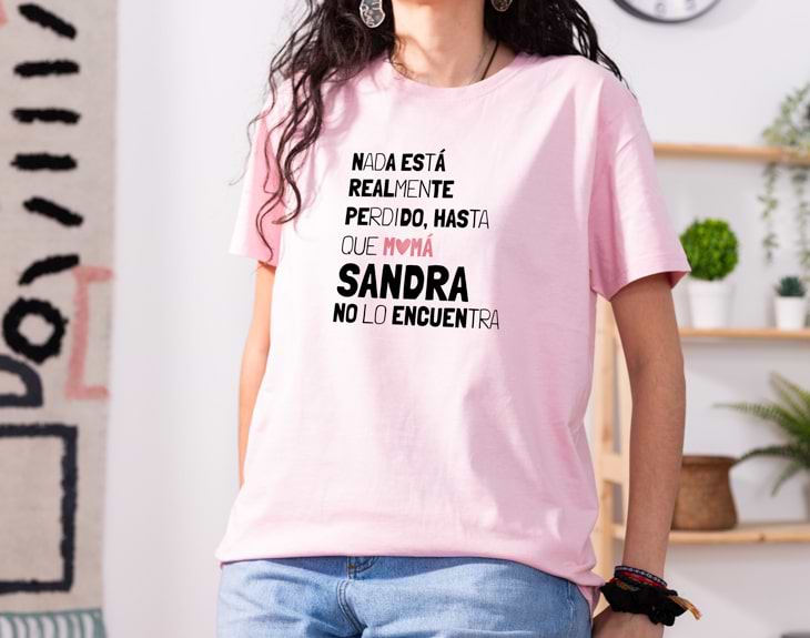 Seguro que antes de dar algo por perdido siempre preguntas a tu mamá para ver si sabe donde está o para que te ayude a buscarlo. ¿Cuántas veces habrás escuchado de su boca la mítica frase de "¿A que voy yo y lo encuentro?? Y es que las madres tienen ese don de encontrar todo lo que se pierde en casa. ¡Son geniales! Por eso, si quieres agradecerle por todas esas veces que hace de rastreadora, nuestra camiseta personalizada con diseño "nada está perdido" está claro que es el mejor regalo que le puedes hacer. Es ideal para sorprenderla por el Día de la Madre, para su cumpleaños o para cualquier ocasión especial. ¡Le encantará! Lo mejor de esta camiseta es que es personalizable. El primer paso a seguir para personalizarla consiste en añadir el producto al carrito y entrar al área de personalización. Una vez ahí, ya puedes escribir el nombre de la mejor mamá del mundo. Pronto estará perfecto y listo para regalar. ¡Será un regalo original para madres! Material: - Algodón: 100% algodón. - Tacto algodón: 100% poliéster cotton touch. - Técnicas: 100% poliéster. Importante: Las medidas son aproximadas, pueden variar 5cm por encima o por debajo.