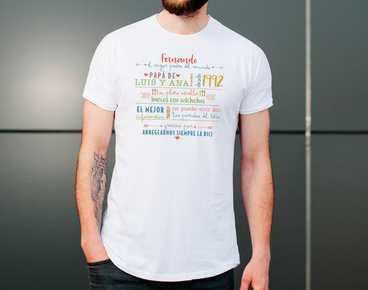 Todos pensamos que nuestro padre es el mejor del mundo. Ha sido él el que nos ha ayudado y criado a lo largo de nuestra vida, el que se despertaba todas las noches para cambiarnos el pañal, y el que nos daba de comer cuando éramos unos bebés. ¿Cuántos momentos has compartido con tu padre? Rememóralos todos y plásmalos en esta camiseta personalizada. ¡No faltará ningún detalle! ¿Cuál ha sido el mejor recuerdo que has vivido con tu padre? Tal vez recuerdas el día que te enseñó a montar en bici, en el que te apoyó incluso cuando pensabas que no ibas a ser capaz; o puede que te acuerdes continuamente de esos huevos con salchichas que te preparaba cuando volvías del cole. Si quieres regalarle algo emocionante y precioso, que signifique mucho para él, este es el detalle ideal. ¿Acaso hay mejor regalo original para el Día del padre que una recopilación de todos esos grandes momentos que habéis vivido juntos? ¡Llevará esta camiseta a todas partes! Así todo el mundo sabrá el padrazo que es. Material: - Algodón: 100% algodón. - Tacto algodón: 100% poliéster cotton touch. - Técnicas: 100% poliéster. Importante: Las medidas son aproximadas, pueden variar 5cm por encima o por debajo.