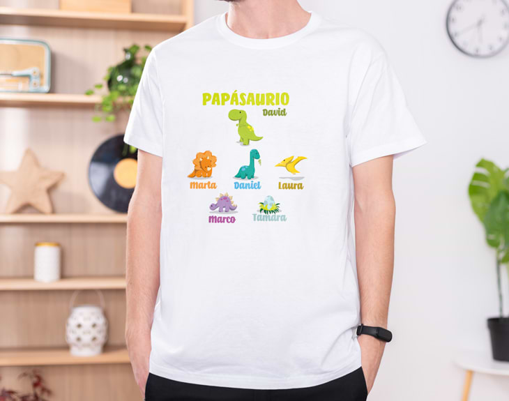 Ser padre es una de las cosas más maravillosas que hay pero también es una de las más cansadas, ya que siempre hay que estar pendientes de los más peques. Por eso, si quieres demostrarle lo afortunado que te sientes de tener al mejor papá del mundo, nosotros tenemos el mejor regalo de todos. ¡Nuestra camiseta personalizada "Papasaurio" es genial, seguro que le encanta! Imagina convertir a toda tu familia en una familia de dinosaurios, ¿A que es genial? Con nuestra camiseta con diseño "Papasaurio", lo conseguirás. ¡Porque es personalizable! Podrás escribir los nombres de los miembros de tu familia. Se convertirá en un original regalo para sorprender a tu papá por el Día del Padre o para cualquier ocasión especial. Personalizar esta camiseta es súper sencillo. El primer paso a seguir consiste en añadir el producto al carrito y entrar al área de personalización. Una vez ahí, ya puedes escribir el nombre que tú quieras. Pronto estarán perfectas y listas para regalar. ¡Será el regalo perfecto para el papá de la casa! Material: - Algodón: 100% algodón. - Tacto algodón: 100% poliéster cotton touch. - Técnicas: 100% poliéster. Importante: Las medidas son aproximadas, pueden variar 5cm por encima o por debajo.