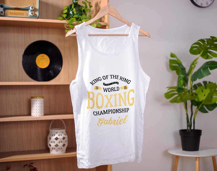 ¿El boxeo es lo tuyo? ¿Es tu deporte favorito? ¿El que más te gusta practicar y donde siempre ganas? Es hora de vestir esta camiseta sin mangas personalizada para ir a todos tus entrenamientos y ser el centro de todas las miradas. Porque, sin duda, esta prenda te dará la energía necesaria para darlo todo. Esta original camiseta es perfecta tanto para ti como si quieres hacerle un regalo a esa persona que ama el boxeo por encima de todo. Y es que podrás elegir el tipo de camiseta que tú quieras: para hombre o mujer, el color y también la talla. ¡Es lo más! Y espera porque todavía queda lo mejor: personalizar tu camiseta con un diseño que no pasará nada desapercibido. Al entrar en el área de personalización, podrás elegir el diseño que más te guste, añadir un nombre y listo. ¡Tendrás la mejor camiseta del mundo! Importante: Las medidas son aproximadas, pueden variar 5 cm por encima o por debajo.