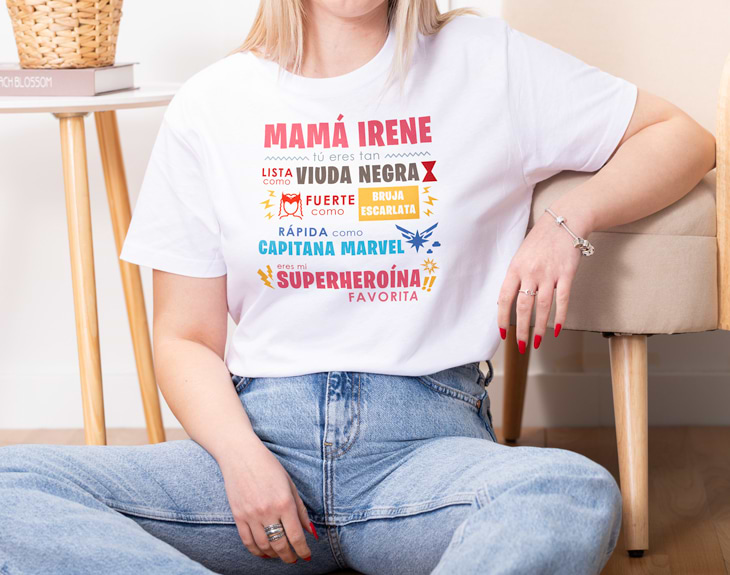 Convierte a tu madre en la superheroína que siempre ha sido con nuestra camiseta personalizada. Gracias a su original diseño, podrás expresarle todo lo que significa para ti. ¡Le encantará! Esta camiseta tan especial es una forma preciosa de agradecer a tu madre todo lo que hace por vosotros día tras día. No dejes pasar la oportunidad de sorprenderla este Día de la Madre. Y lo mejor de todo: ¡es personalizable! Podrás añadir el nombre que tú elijas, y nosotros nos encargamos de hacerlo realidad en esta prenda. Personalizar tu camiseta nunca fue tan fácil. Solo tienes que añadir el producto al carrito y entrar al área de personalización. Allí podrás escribir el nombre de la mejor madre del mundo, y en un abrir y cerrar de ojos, ¡tendrás el regalo perfecto! Sin duda, un regalo original para madres que hará que cualquiera se emocione. Material: - Algodón: 100% algodón. - Tacto algodón: 100% poliéster cotton touch. - Técnicas: 100% poliéster. Importante: Las medidas son aproximadas, pueden variar 5cm por encima o por debajo.