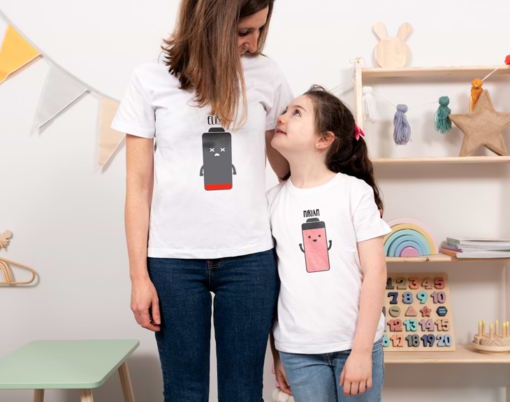Si vuestro hijo no para quieto y os gasta toda la batería a lo largo del día, este es vuestro regalo original con el que, además, te reirás muchísimo. Estos packs de camisetas personalizadas son ideales para el Día de la Madre. Imagínate un domingo de paseo con tus hijos y la mamá y el pequeño con una camiseta personalizada. ¿No es genial? Antes de pagar, te pediremos que nos indiques todos los nombres de los que se vayan a poner las camisetas, así como si el hijo es niña o niño. Son de poliéster y tienen un efecto traslúcido. Importante: Las medidas son aproximadas, pueden variar 5cm por encima o por debajo.