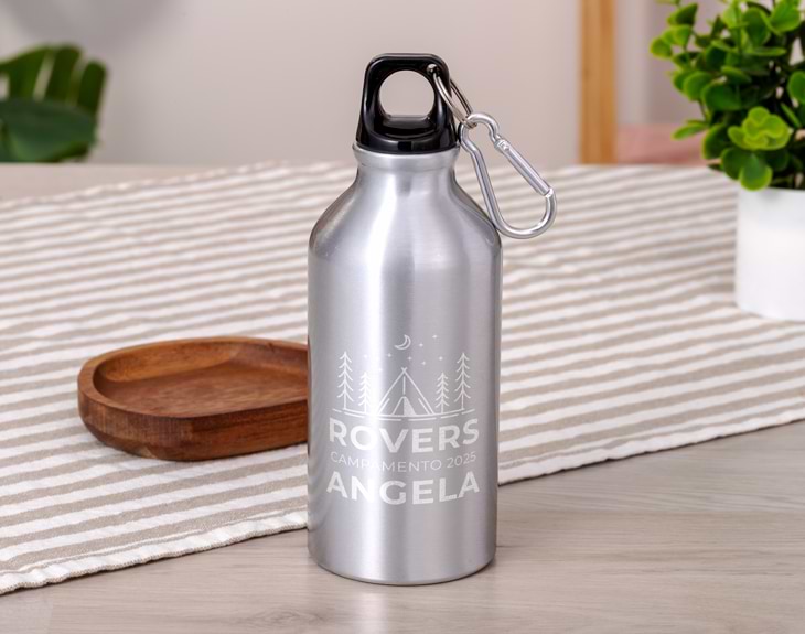 Es verano y todos sabemos que lo que toca: ¡irse de campamento! Es hora de preparar tu mochila para pasar unos días inolvidables en el campo y si hay algo que no se te puede olvidar es esta cantimplora personalizada tan chula. Sin duda, te mantendrá hidratado hagas lo que hagas. Si este año quieres ser la envidia de todos tus amigos del campamento, solo vas a necesitar esta original cantimplora. Ideal para mantener el agua fresquita durante horas y preparada para vivir miles de aventuras a tu lado. Además, en su diseño podrás añadir el texto que quieras para no perderla nunca. Y toca la mejor parte, personalizar tu cantimplora para que sea única. Entra en nuestro diseñador, escribe lo que quieras y nosotros nos encargamos de grabarlo para que dure para siempre. ¡Sin cantimplora no hay campamento! Dimensiones: 16 cm. Capacidad: 400 ml.