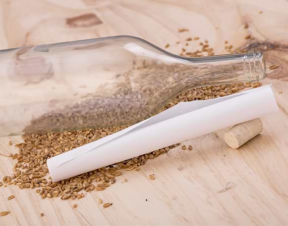 botella de cristal transparente con tapón de corcho, que actúa como recipiente y “envoltorio” de nuestra carta y, por otro, tenemos la