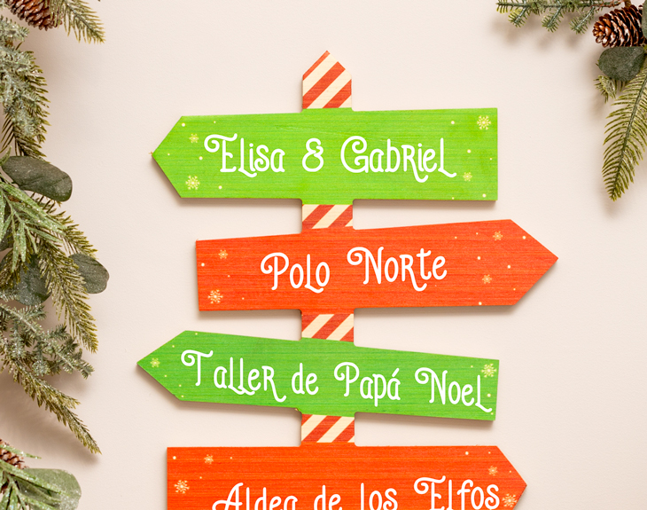 ¿Necesitas decoración original para tu casa en Navidad? Nuestro cartel de flechas de madera personalizado es una idea super chula que te encantará. Y es que es completamente personalizable y con temática navideña. Podrás poner los textos que quieras en las flechas y elegir el color: puede ser rojo y verde en conjunto o rojo y verde por separado. Puedes darle rienda suelta a tú imaginación y según dónde lo quieras poner dar instrucciones distintas de a dónde llevan las flechas, o también puedes inventártelo: el polo norte, el taller de los duendes de Santa Klaus, aparcamiento de renos... Cualquier idea es buena y quedará de lujo como decoración en tu casa. Conseguirlo es súper sencillo: una vez lo añadas al carrito podrás personalizarlo con el texto que quieras y hacerte una idea de cómo queda, también podrás elegir los colores que peguen más con el resto de decoración de tu casa. Es una idea muy original que sorprenderá a todas las personas que visiten tu casa. Material: madera. Medidas: 33 cm x 58 cm.