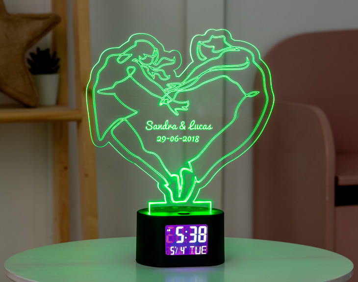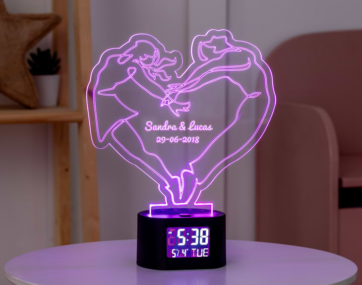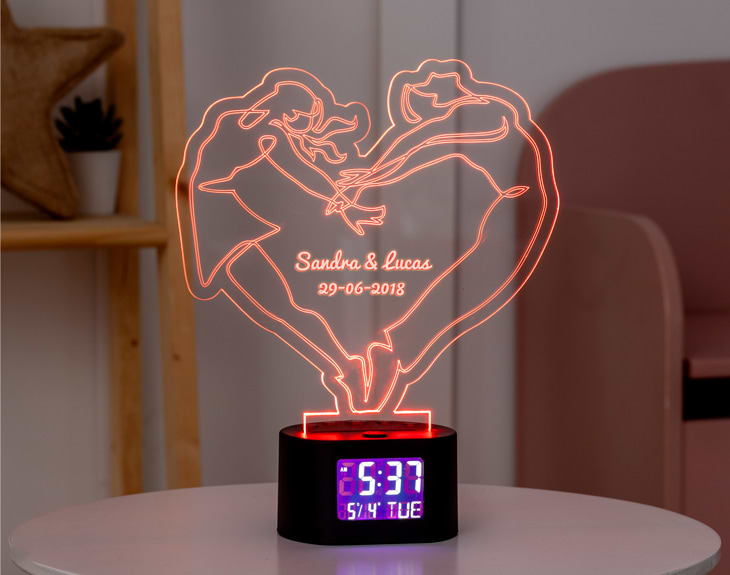 Si sois la pareja más bailarina del lugar, nuestro reloj-despertador luminoso personalizado es perfecto para que todo el mundo cuando vaya a vuestra casa vea que lleváis el ritmo en las venas. Seguro que os ponéis la música a tope cada vez que hacéis limpieza y acabáis saltando y bailando por toda la casa. Por eso, nuestro cartel luminoso es perfecto para sorprender a tu otra mitad. Está formado por una lámina de metacrilato y un reloj digital con la hora y la fecha. Además, podrás programar las alarmas que necesites para cuando llegue la hora de despertarse. Puedes encenderlo usando pilas (para poner en marcha el reloj) y conectándolo a la luz (para que se ilumine). Se trata de un cartel de metacrilato que funciona por un sistema de luces de lo más divertido. Consta de cuatro posiciones que te permiten cambiar el color de la lámpara a morado, rojo, verde y azul. Medidas aproximadas de la base: 8,5x7,5x5cm. Importante: puedes encenderlo usando pilas (para poner en marcha el reloj) y conectándolo a la luz (para que se ilumine). Importante: la pantalla del reloj muestra la hora ininterrumpidamente, y tiene un botón “light zzz” para que se encienda la luz durante unos pocos segundos. Importante: pilas no incluidas.