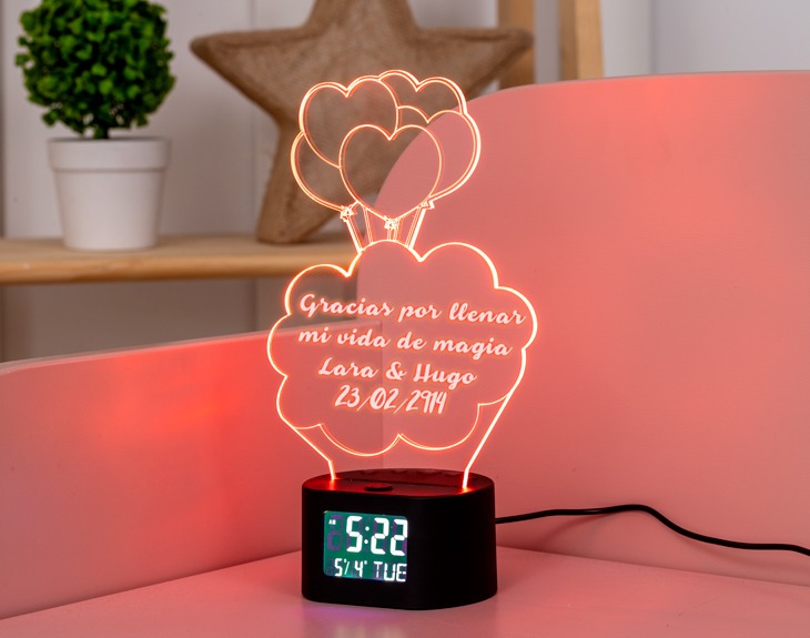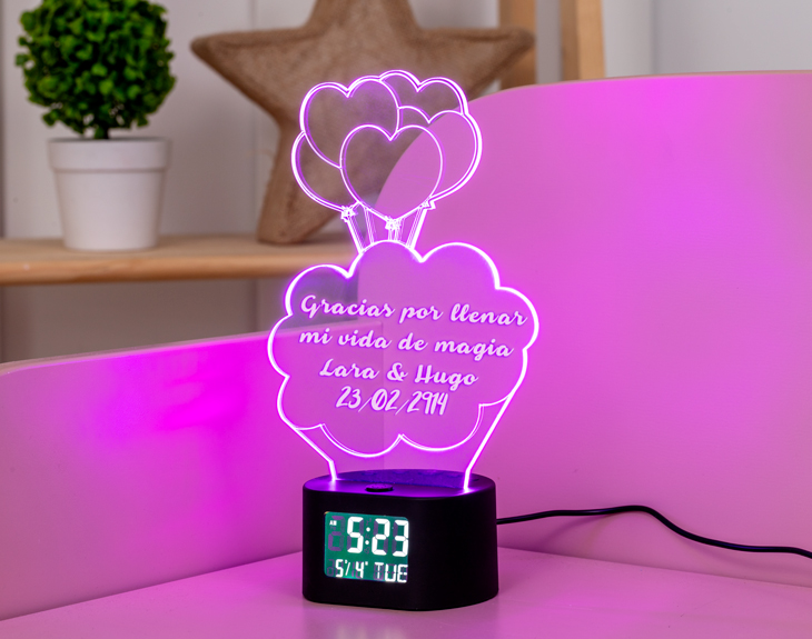 El reloj-despertador luminoso personalizado perfecto para regalar al amor de tu vida. Si tu también has tenido la suerte de conocer a esa persona que te complementa, te respeta y te quiere muchísimo, es el momento de demostrarle lo importante que es para ti. ¿Se te ocurre una forma más especial? Si sientes que juntos podéis llegar hasta el fin del mundo, este diseño está hecho para vosotros. Solamente necesitamos que nos digas vuestros nombres y el texto para grabar. Está formado por una lámina de metacrilato y un reloj digital con la hora y la fecha. Además, podrás programar las alarmas que necesites para cuando llegue la hora de despertarse. Puedes encenderlo usando pilas (para poner en marcha el reloj) y conectándolo a la luz (para que se ilumine). Se quedará sin palabras cuando vea este festival de luces con vuestro nombre. ¡Le encantará! Importante: puedes encenderlo usando pilas (para poner en marcha el reloj) y conectándolo a la luz (para que se ilumine). Importante: el propio reloj te dará la posibilidad de elegir el color de las luces. Si pulsas una vez te saldrá un color, si pulsas de nuevo, aparecerá otro, y así sucesivamente. También podrás elegir la opción intermitente: ¡todas las luces creando un festín de colores! Medidas aproximadas de la base: 8,5x7,5x5cm. Importante: la pantalla del reloj muestra la hora ininterrumpidamente, y tiene un botón “light zzz” para que se encienda la luz durante unos pocos segundos. Importante: pilas no incluidas.