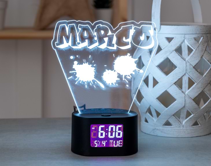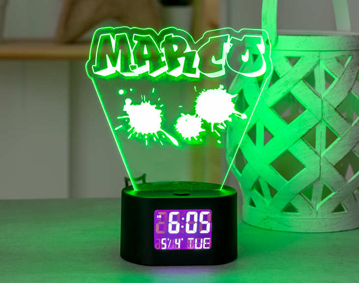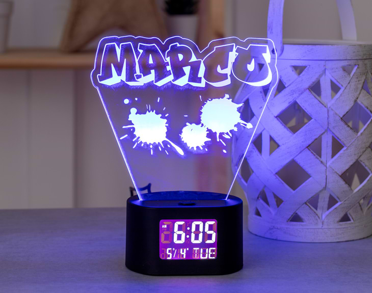 Si estás cansado o cansada de hacer regalos convencionales y estás buscando un detalle realmente original, nuestro cartel luminoso personalizado "Nombre en Graffiti" es la solución. Se trata de un cartel de metacrilato que funciona por un sistema de luces de lo más divertido. Consta de cuatro posiciones que te permiten cambiar el color de la lámpara a morado, rojo, verde y azul. Si quieres que su habitación sea una fiesta de colores y alegría, este es el regalo perfecto. Solo necesitamos su nombre para personalizarlo y que sea aún más increíble. ¡Le gustará muchísimo! Está formado por una lámina de metacrilato y un reloj digital con la hora y la fecha. Además, podrás programar las alarmas que necesites para cuando llegue la hora de despertarse. Puedes encenderlo usando pilas (para poner en marcha el reloj) y conectándolo a la luz (para que se ilumine). Importante: el propio reloj te dará la posibilidad de elegir el color de las luces. Si pulsas una vez te saldrá un color, si pulsas de nuevo, aparecerá otro, y así sucesivamente. También podrás elegir la opción intermitente: ¡todas las luces creando un festín de colores! La base negra del metacrilato es un reloj despertador. Medidas aproximadas de la base: 8,5x7,5x5cm. Importante: puedes encenderlo usando pilas (para poner en marcha el reloj) y conectándolo a la luz (para que se ilumine). Importante: esta tipografía por su tamaño no admite tildes en las palabras. Importante: la pantalla del reloj muestra la hora ininterrumpidamente, y tiene un botón “light zzz” para que se encienda la luz durante unos pocos segundos. Importante: pilas no incluidas.