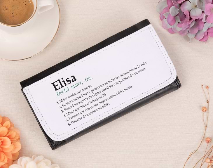 Si te pones delante de un folio blanco para escribirle algo bonito a tu madre, pero no te sale nada nunca. ¡No te preocupes! Esta cartera personalizada te salvará la vida. No te preocupes tampoco si estás muy pillado de tiempo para el Día de la Madre, esta cartera también te salvará el regalo para mamá. ¿Por qué? Porque ya está la definición de tu madre escrita; solo tendrás que añadir su nombre, y tendrás todo hecho. ¿Qué te parece? Un regalo estupendo para verle sonreír siempre a tu mamá.