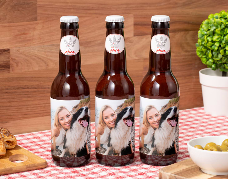 El regalo perfecto para todo buen cervecero que se precie: seis tercios de cerveza artesanal con la etiqueta personalizada. ¡Le encantará! La base es Mica, una de las referencias imprescindibles de la cerveza artesanal española. Se elabora en la Sierra de Fuentenebro, donde al amparo de ese mineral (la mica) crece una cebada excelente. Es una cerveza con un sabor exclusivo, perfecta para sorprender a los paladares más sibaritas. Por si todo eso fuera poco, la etiqueta de los seis tercios va personalizada con la foto que desees. Un regalo único para sorprender a todo buen amante del zumo de cebada. Podrás elegir si quieres personalizar las seis cervezas con el mismo diseño para todos o con un diseño diferente para cada una de ellas.