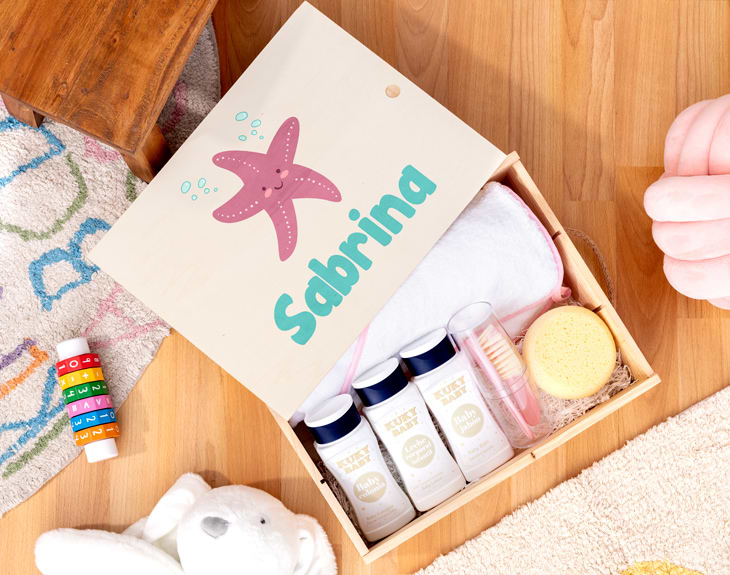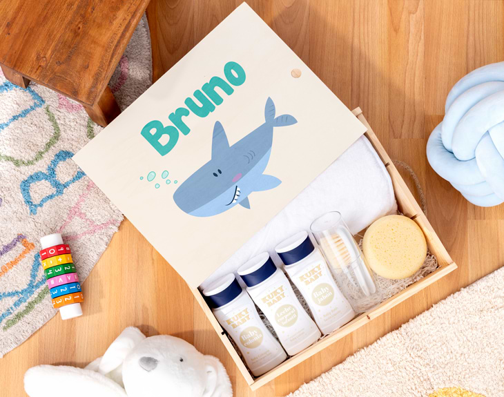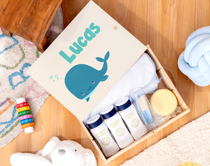 ¡Un nuevo y pequeño miembro ha llegado a la familia! Si quieres consentir al peque de la casa en sus momentos más relajantes, hazlo con esta caja de baño personalizada tan mona. Y es que los primeros baños de un recién nacido, son momentos muy especiales para sus papis, y con este pack se convertirán en algo inolvidable. Sorprende a esa pareja que acaban de ser papás con esta original caja de madera que les vendrá genial durante los primeros meses de vida de su bebé. En su interior contiene todo lo necesario para que los baños del peque de la casa sean de lo más completos: una capa de baño, esponja, cepillo y un pequeño set con jabón, leche corporal y colonia. ¡Es lo más! Pero sin duda, lo mejor de este detalle es que podrás personalizar la caja de madera con este diseño tan cuqui donde los protagonistas son estos animales marinos tan adorables. Al añadir el producto al carrito, entrarás en el área de personalización. Ahí, podrás elegir el diseño que más te guste y completarlo con el nombre del bebé para que quede perfecto. ¡Será el mejor regalo del mundo! Medidas: - Caja de madera: 29 cm x 10 cm x 37 cm. - Capa de baño: 105 x 90 cm.