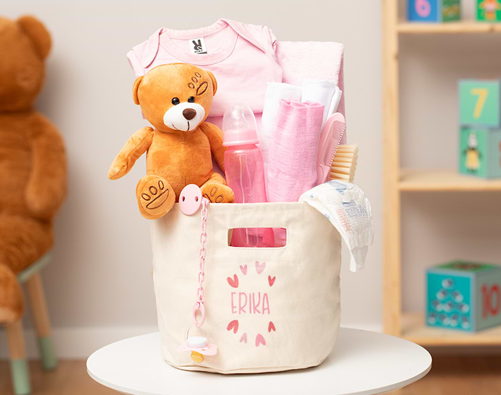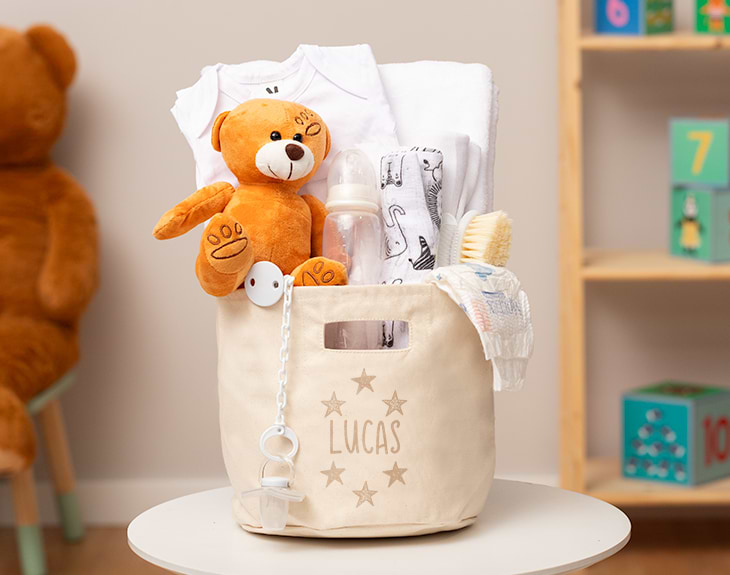 • Cesta para bebés personalizada (opcional). • 15 pañales. • Manta. • 3 gasas. • Pack de cepillo y peine. • Biberón. • Osito de peluche. • Chupete y sujeta chupete. • Body. • Protector de chupete. • Tarjeta recordatoria.