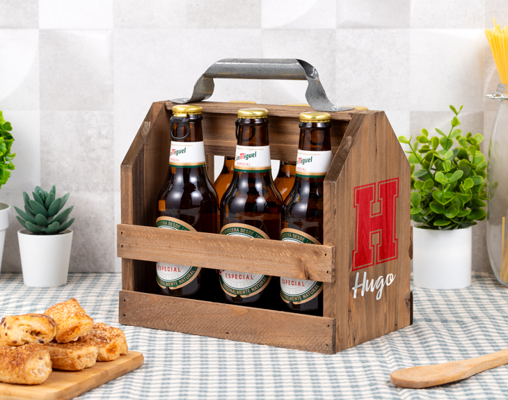 Es el momento de hacerte con el accesorio perfecto para guardar tus cervezas favoritas. Esta cesta de madera es genial para utilizarla en ocasiones especiales, cuando te reúnes con tu familia y amigos y queréis disfrutar de una cerveza bien fresquita. Podrás guardarlas en este utensilio y llevarlas donde tú quieras de forma cómoda y fácil. Y además, es único porque podrás personalizarlo como tú quieras. Sin duda, este original regalo es perfecto para sorprender a alguien en su cumpleaños, en el amigo invisible o en cualquier otra fecha importante. Esta cesta hecha de madera, cuenta con espacio para guardar hasta seis botellines de tu cerveza favorita, un asa para poder transportarlo donde quieras y un abridor en el lateral. Pero lo mejor es su diseño, ya que podrás añadir la inicial que quieras con este singular estilo 'college'. ¡Es lo más! Personalizar esta cesta de madera es muy sencillo. Añade el producto al carrito y entra en el área de personalización. Una vez dentro, lo único que tienes que hacer es elegir la inicial del color que quieras y terminar el diseño con el nombre que quieras. ¡Será el mejor regalo del mundo! Tienes la posibilidad también de adquirir la cesta con 6 botellines de cerveza. ¡Crea tu propio pack! Medidas: 15 x 19,5 x 22 cm. Material: madera. Importante: Las maderas tienen vetas y estas quedan reflejadas en la imagen.