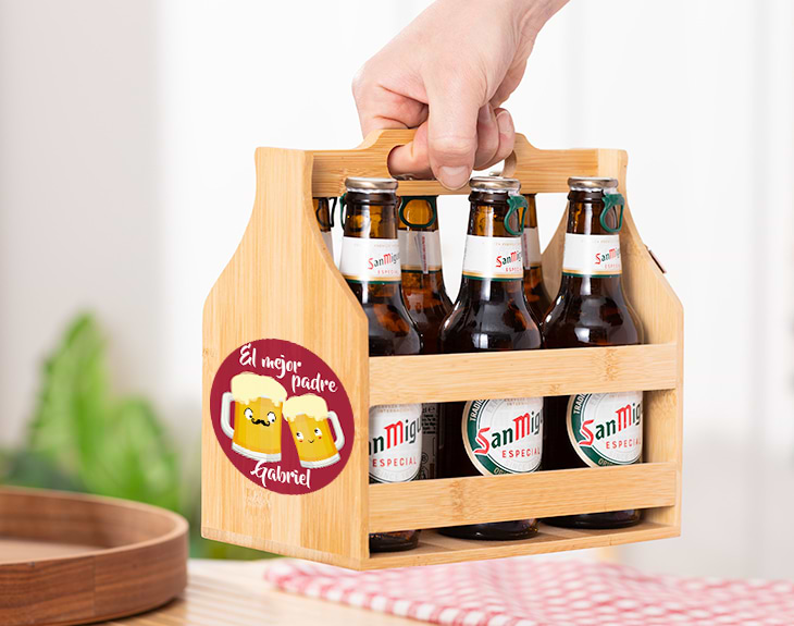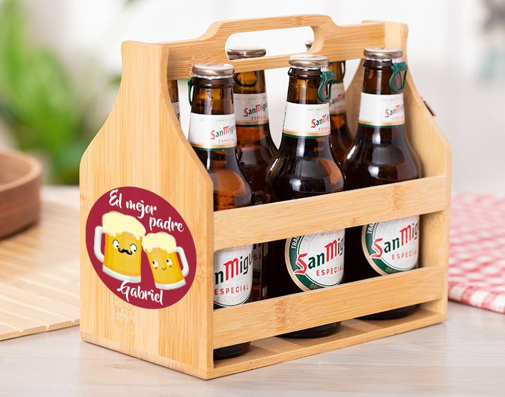 Si tienes la suerte de tener al mejor padre del mundo, esta cesta de madera personalizada para cervezas está hecha para él. Y es que, si entre las muchísimas cosas que te ha enseñado está la del amor por la cerveza, este regalo original le encantará. Se trata de una elegantísima cesta de madera para guardar sus botellines, además, contiene un abridor, un accesorio muy práctico para poder disfrutar de sus cervezas en cualquier lugar. Seguro que está deseando tener visitas en casa para sacar allí las cervezas y presumir delante de todos sus amigos. ¡La mejor presentación del mundo! Para personalizarla, solamente tendrás que introducir su nombre en nuestro diseñador. Para que te puedas hacer una idea de cómo quedará, te mostraremos una previsualización, así mismo, podrás cambiar el tamaño o la posición del nombre si fuera necesario. Si en vuestro casa la afición por la cerveza pasa generación a generación, este diseño tan divertido está hecho para tu padre. ¡Se morirá de ilusión al verlo! Ahora sí que sí, es el momento de abrir una cervecita juntos y disfrutar de un ratito muy especial. Medidas: 15x19,5x22cm. Material: madera. Importante: Las maderas tienen vetas y estas quedan reflejadas en la imagen.