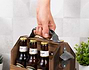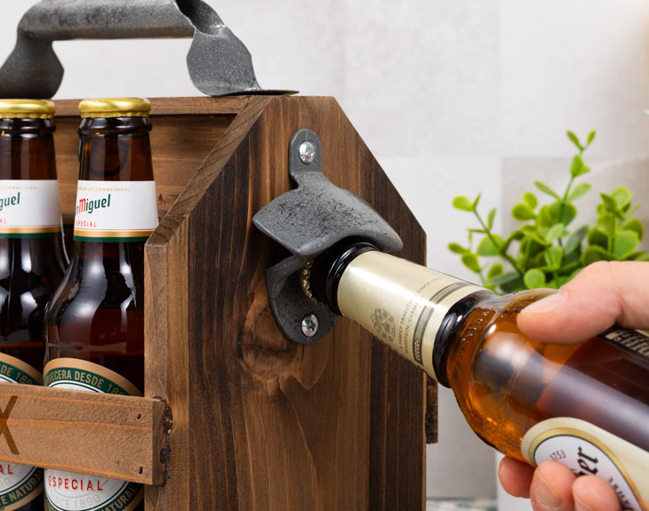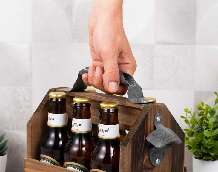 • Cesta de madera premium para cervezas. • Tarjeta recordatoria. IMPORTANTE: Prohibida la venta de bebidas alcohólicas a menores de 18 años.