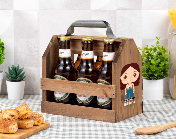 ¿A quién no le gusta disfrutar de una cerveza bien fresquita en su tiempo libre? Si tú también conoces a esa persona que ama la cerveza por encima de todo y le encanta tomarla siempre que puede, sorpréndela con esta cesta de madera tan especial. Es el accesorio perfecto para que pueda guardar sus cervezas favoritos en alguna ocasión especial. Si se acerca un cumpleaños, el amigo invisible o incluso tu aniversario, no dudes que con este original regalo triunfarás en cualquiera de estas ocasiones. Esta caja para cervezas hecha de madera será el mejor regalo de mundo. Cuenta con espacio para guardar seis cervezas, un asa para poder transportarla y un abridor en uno de los laterales. ¡Lo tiene todo! Llega el momento de personalizar esta cesta de madera con un diseño único: ¡nuestros divertidos muñecos Tinok! Añade el producto al carrito y entra en el área de personalización. Lo único que tienes que hacer es crear tu muñeco desde cero con todos los detalles que quieras y finalizar con el nombre de esa persona que va a recibir este regalo tan guay. ¡Se quedará sin palabras! Tienes la posibilidad también de adquirir la cesta con 6 botellines de cerveza. ¡Crea tu propio pack! Medidas: 15 x 19,5 x 22 cm. Material: madera. Importante: Las maderas tienen vetas y estas quedan reflejadas en la imagen.