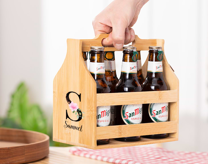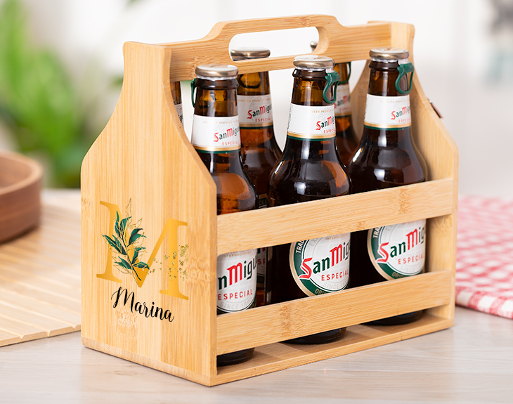 ¿Estás buscando un regalo original para amantes de la cerveza? Tenemos la opción perfecta, ¡una cesta de madera para cervezas personalizada con su nombre e inicial! Además, tiene un diseño floral de lo más elegante, perfecto para decorar cualquier rincón de la casa. Un detalle muy especial para dejar sin palabras a ese amigo o amiga que nunca dice que no a un plan de cañas. Y es que, si no hay nada que disfrutéis más que esos ratitos juntos tomando una cervecita y contándoos mil anécdotas, este regalo le encantará. Para personalizarlo, únicamente tienes que seleccionar su inicial y decirnos su nombre, ¡nosotros nos encargamos del resto! Si quieres hacer el regalo completo, te recomendamos escoger la opción que incluye botellines, así podréis estrenarlo por todo lo alto. Directas a la nevera y una tarde de conversación y risas, ¡la diversión está asegurada! Medidas: 15x19,5x22cm. Material: madera. Importante: Las maderas tienen vetas y estas quedan reflejadas en la imagen.
