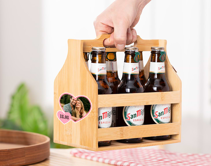Siempre es un buen momento para celebrar el amor y la amistad. Decirle a tu familia, amigos y seres queridos lo importante que son para ti y lo mucho que les quieres. Agradecer a esas personas tan especiales que estén contigo en todo momento, ayudándote, escuchándote y demostrándote todo su cariño. Por eso, seguro que has pensado en sorprender a esa persona que siempre está contigo y con la que compartes una cerveza bien fresquita en una terraza con una conversación infinita, ¿verdad? Tenemos el regalo perfecto, esta cesta de madera personalizada con un diseño de corazones rosas que es de lo más adorable. ¡Estará deseando estrenarla! Esta original cesta es el detalle perfecto para los amantes de la buena cerveza. Por eso, si quieres que el regalo sea lo más completo posible, elige la opción de cesta con botellines. Así, nada más recibir el regalo podréis disfrutar de una buena cerveza juntos. No existe un plan mejor que tener siempre a mano esta bebida para compartirla con quien más quieres. Lo mejor de este regalo es que te toca personalizar la cesta a medida. Te proponemos cuatro preciosos diseños llenos de corazones en los que podrás añadir tanto imágenes como texto. Elige la foto que más te guste con esa persona especial y añade vuestra fecha nombres o lo que quieras. Además, es perfecta para decorar cualquier estancia de la casa dándole un toque único. Y no solo eso, también es un regalo muy práctico, y es que si su salón es el lugar de reuniones por excelencia, le vendrá genial para servir a sus invitados unas buenas cervezas. Medidas: 15x 19,5 x 22 cm. Material: madera. Importante: Las maderas tienen vetas y estas quedan reflejadas en la imagen.