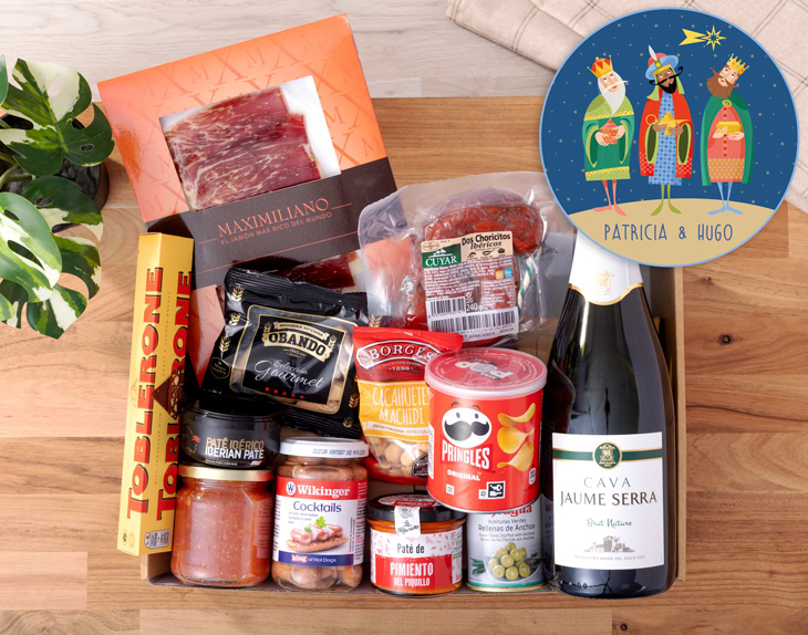Este año los Reyes Magos traen un regalo mucho más variado que el oro, el incienso y la mirra. El día 6 de enero no puede faltar un buen menú, y el roscón tradicional es un buen postre. Sin embargo, ¿qué pasa con el resto de la comida? Para que ese día sea aún más especial para toda la familia, sorpréndeles con esta cesta gourmet personalizada. ¡Puede ser su regalo más original! Y será un regalo que todo el mundo podrá disfrutar. Ese día de Reyes es un día de compartir, con tus hijos, con tus primos y tíos, y llevarles a todos un poco de alegría navideña. Por ello, hemos llenado esta cesta de la mejor variedad de productos gastronómicos de excelente calidad. Los más pequeños disfrutarán del chocolate con los M&M's, y los adultos no podrán resistirse al mejor paté a la pimienta verde o el jamón de Jabugo. Y por supuesto, podréis brindar por el comienzo de este año con la botella que queráis dentro de esta variedad: desde champagne hasta cava. La comida siempre es el mejor regalo, ya sea de cumpleaños o de Navidad. Por ello, puedes convertir esta cesta en la mejor sorpresa de Reyes con la caja de cartón kraft personalizada. ¡Escribe el nombre de tus hijos o de esos familiares tan queridos a los que vas a ver estas fiestas! Importante: La marca del vino puede variar según stock.