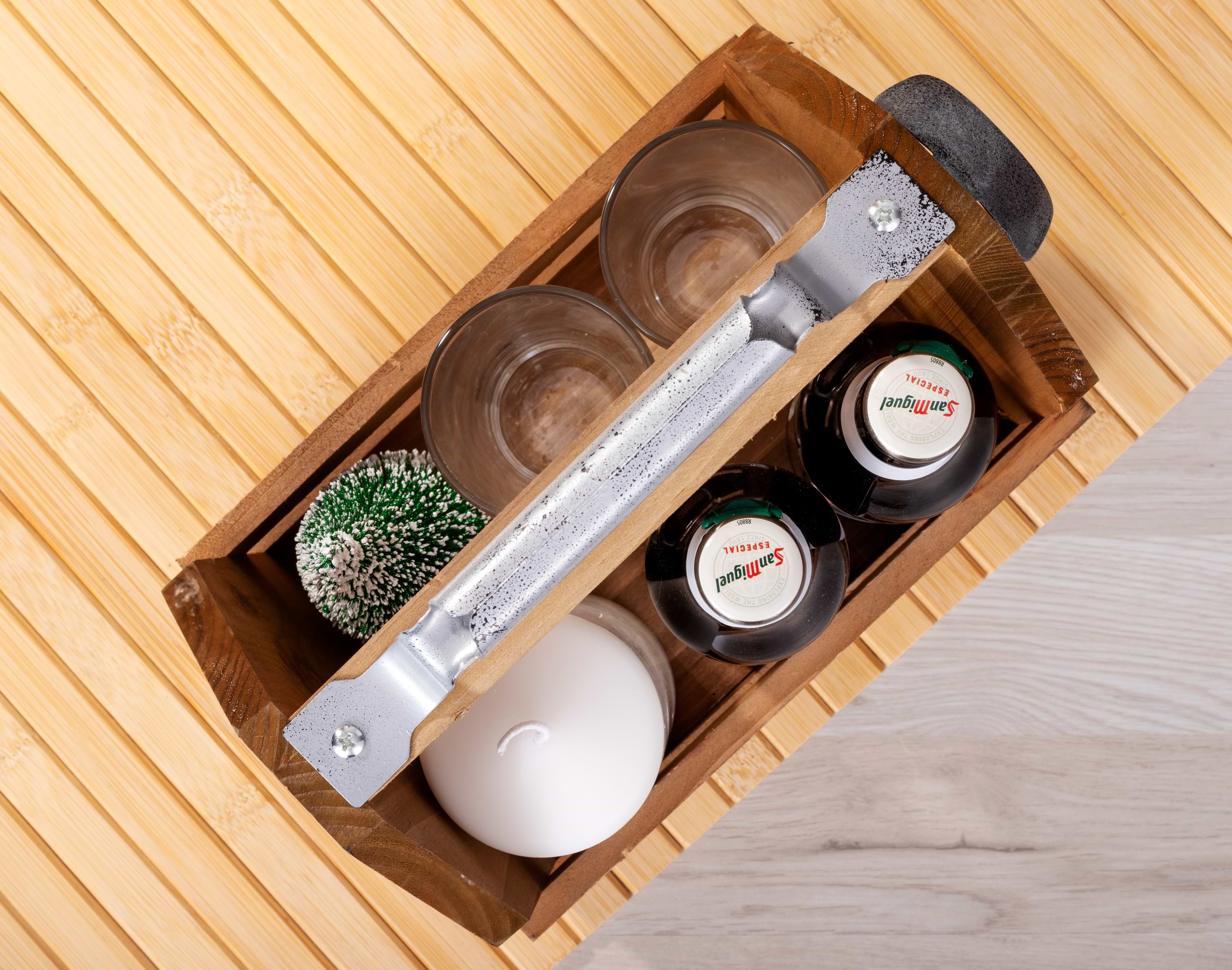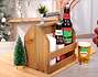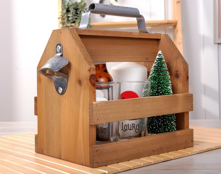 • Cesta de madera con abrebotellas integrado. • Dos cervezas personalizadas. • Dos vasos de caña 200 ml personalizados. • Una vela blanca. • Un árbol de navidad pequeño. • Tarjeta recordatoria. IMPORTANTE: Prohibida la venta de bebidas alcohólicas a menores de 18 años.
