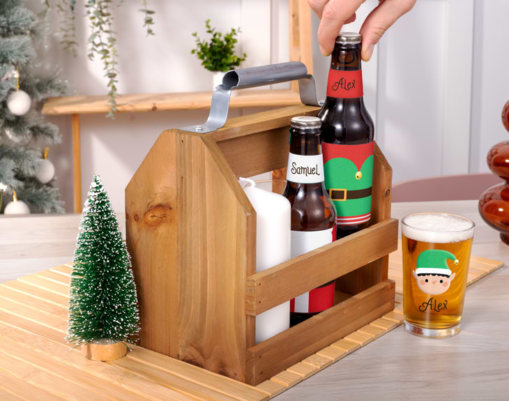 Llega la Navidad y con ella la ilusión de regalar y compartir momentos especiales con tus seres queridos. Por eso, este pack navideño es justo lo que necesitas para sorprender y brillar con los regalos de Navidad. Les encantará. Este pack incluye una cesta de madera con cervezas personalizadas, con un abrebotellas metálico integrado a un costado, un set de vasos de caña personalizados y, para darle un toque especial a la decoración navideña de tu hogar o mesa, un pequeño árbol de Navidad y una vela blanca, los detalles infalibles para estas fiestas. Es el perfecto regalo para amigos que disfrutan de esta época y adoran los detalles personalizados. Además de todo lo que incluye el pack, puedes añadir los diseños más divertidos de trajes navideños y personalizarlo con el nombre de la persona a quien quieres sorprender con este regalo tan único y lleno del espíritu mágico que transmite esta época tan bonita. Personalizar es súper fácil: añade el pack al carrito, elige el diseño que más te guste para las cervezas y para los vasos, escribe el nombre o la frase corta que prefieras, y listo en solo segundos tendrás el regalo navideño más original que dejará a todos con la boca abierta. Medidas de la cesta: 15x19,5x22 cm. Material: madera y un abrebotellas metálico integrado. Vasos de caña: 200 ml.
