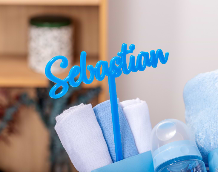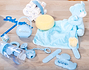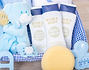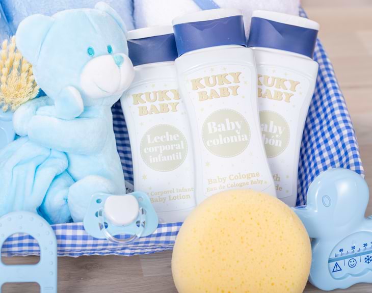 • Cesta azul. • 250ml Jabón infantil. • 250ml Leche corporal infantil. • Chupete. • Sujeta chupete. • Funda de chupete personalizada. • Mordedor. • Termómetro. • Manta personalizada. • Dou dou. • Osito de peluche • Pack de peine y cepillo. • Body personalizado. • Capa de baño personalizada. • Esponja. • 240ml biberón. • 5 pañales • 3 gasas. • Babero. • Nombre en metacrilato personalizado. • Tarjeta Recordatoria.