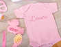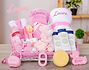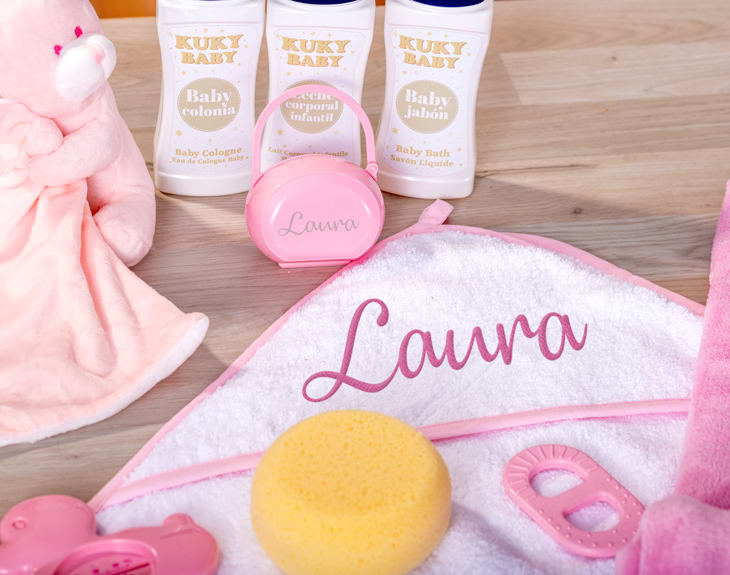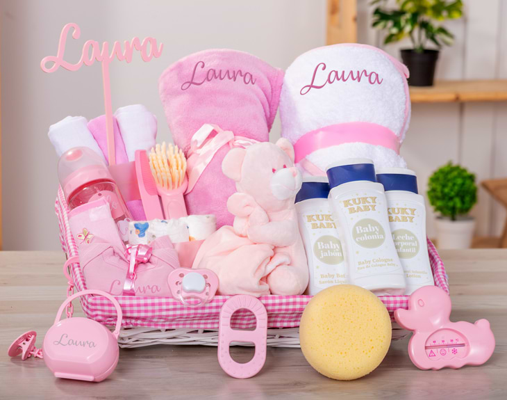• Cesta rosa. • 250ml Jabón infantil. • 250ml Leche corporal infantil. • Chupete. • Sujeta chupete. • Funda de chupete personalizada. • Mordedor. • Termómetro. • Manta personalizada. • Dou dou. • Osito de peluche • Pack de peine y cepillo. • Body personalizado. • Capa de baño personalizada. • Esponja. • 240ml biberón. • 5 pañales • 3 gasas. • Babero. • Nombre en metacrilato personalizado. • Tarjeta Recordatoria.