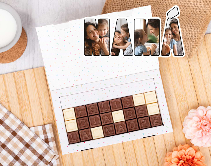 Si hay alguien que se merece todo y más, esa es tu madre. Porque desde el día que naciste hasta hoy te ha apoyado en todas tus decisiones, sabe lo que piensas con solo mirarte y siente un amor incondicional que nadie más entiende. Por eso, y por mucho más, se merece un regalo así de original con el que demostrarle que valoras todo lo que hace por ti y que la quieres más que a nada. Basta con que nos digas la frase que quieres añadir en el chocomensaje y selecciones cuatro fotos para personalizar la caja. Tenemos disponibles dos tipos de chocomensajes, uno de 24 caracteres y otro de 32. Medidas: -Tamaño de cada letra:2,3cm x 2,3cm -Tamaño de la caja: 23cm x 11cm x 2,5cm